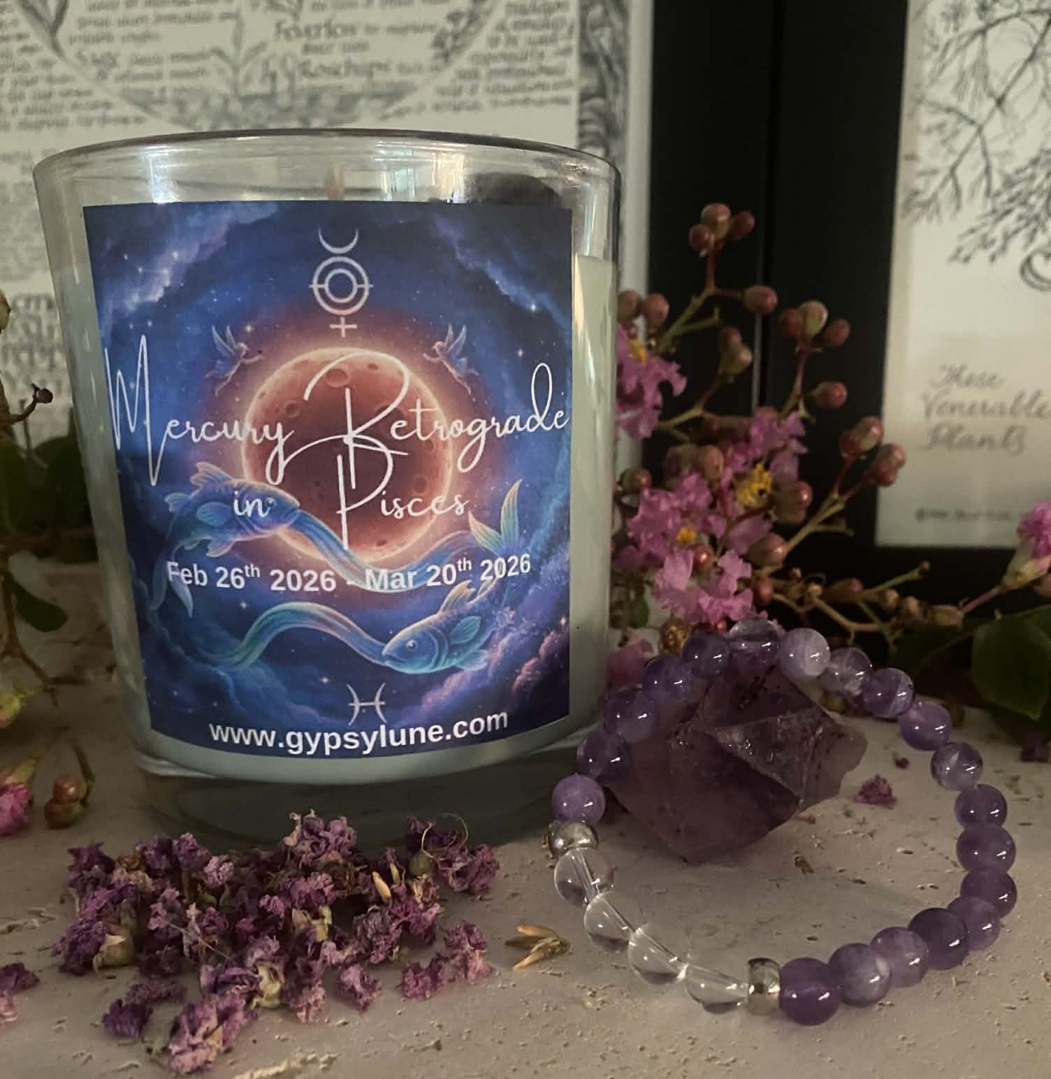 Amethyst calms the overactive, emotional mind often associated with Pisces, bringing inner peace. Wear your bracelet every day during Mercury Retrograde and burn your candle every every night!
